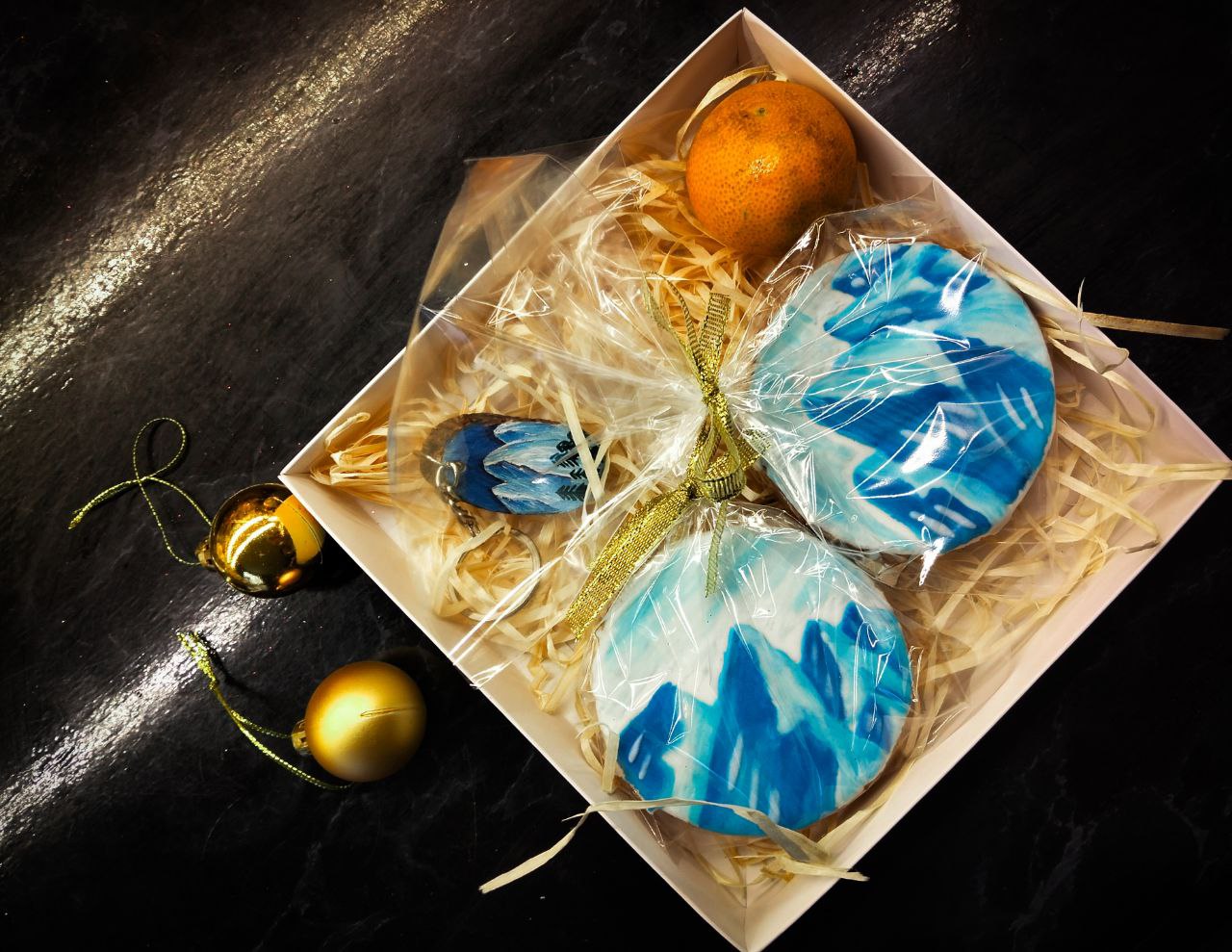 Подарунковий набір імбирних пряників з Карпат “Сніжні вершини” – два солодких пряника з декором ручної роботи, дерев’яний брелок із смерекової гілочки, мандаринка для настрою. Набір упакований в крафтову різдвяну коробочку.