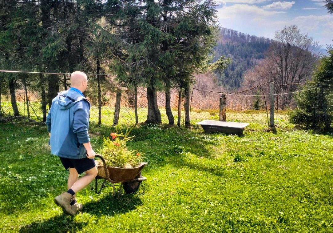 • весняний благоустрій території – прибирання сухого листя, організація місць відпочинку, сезонний догляд за рослинами (у нас ростуть едельвейси, лаванда, маємо живий паркан із молодих смерек)